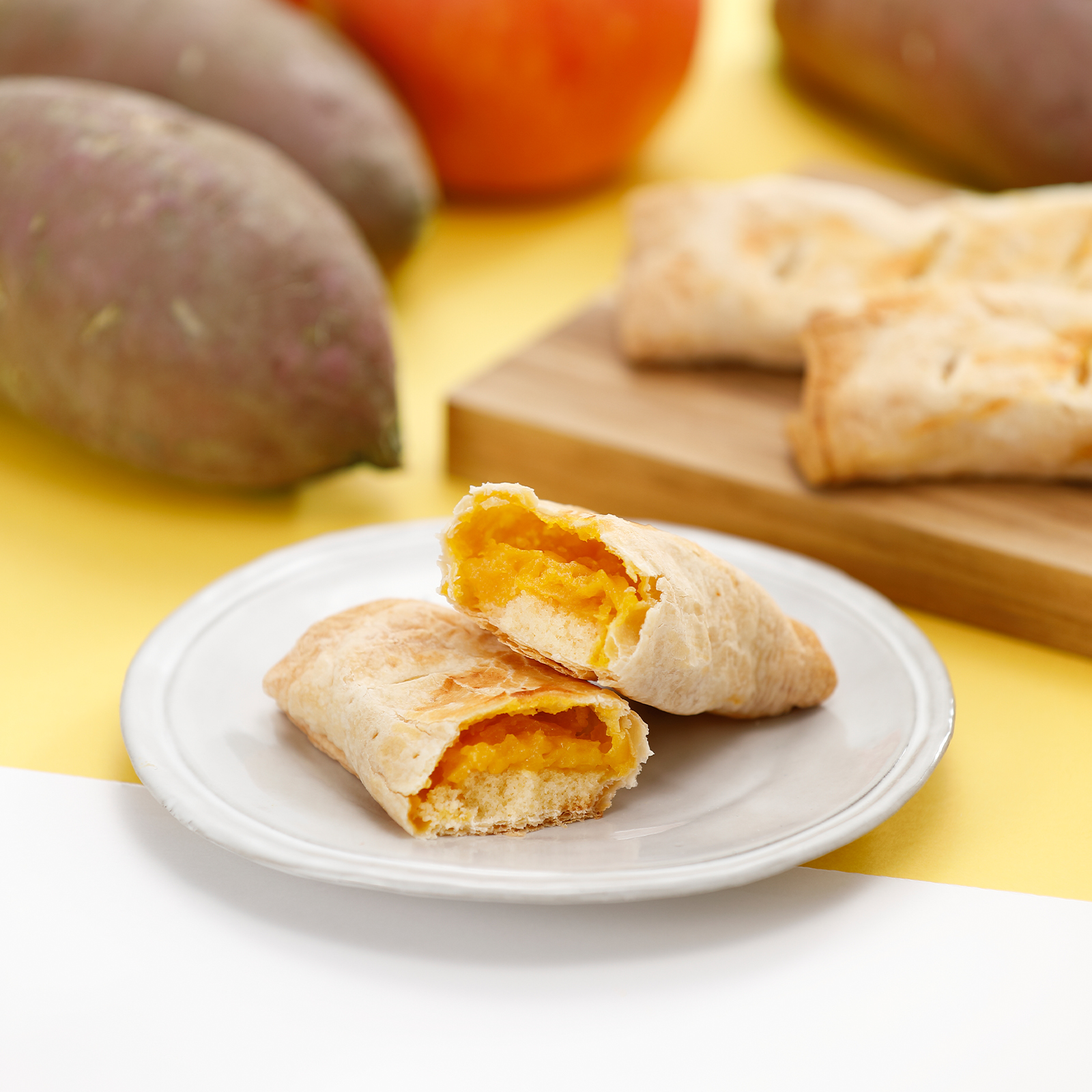 さつまいもペーストに青森県産リンゴのシロップ漬けを混ぜ込み、スポンジ生地と一緒にパイで包み焼き上げました。